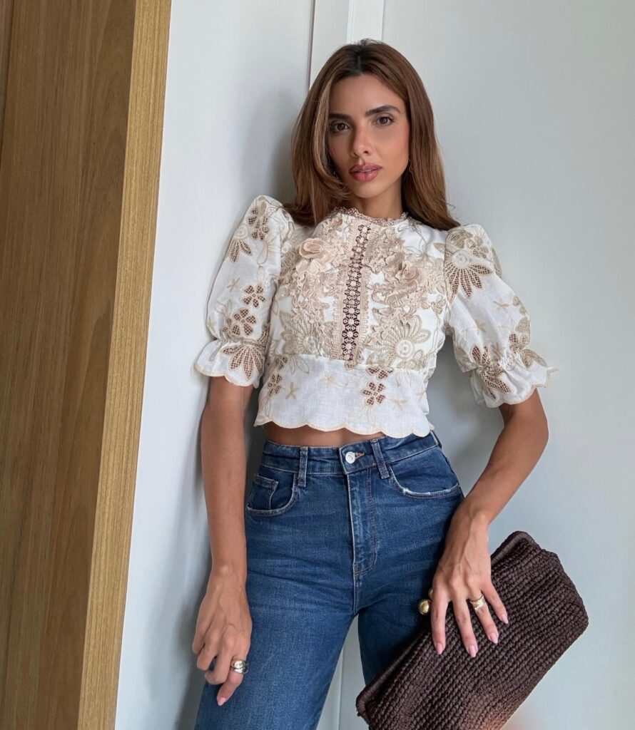 A Blusa Cropped Bordado Floral e uma verdadeira obra de arte. Com bordados florais em tom bege sobre base branca, manga bufante e acabamento artesanal.