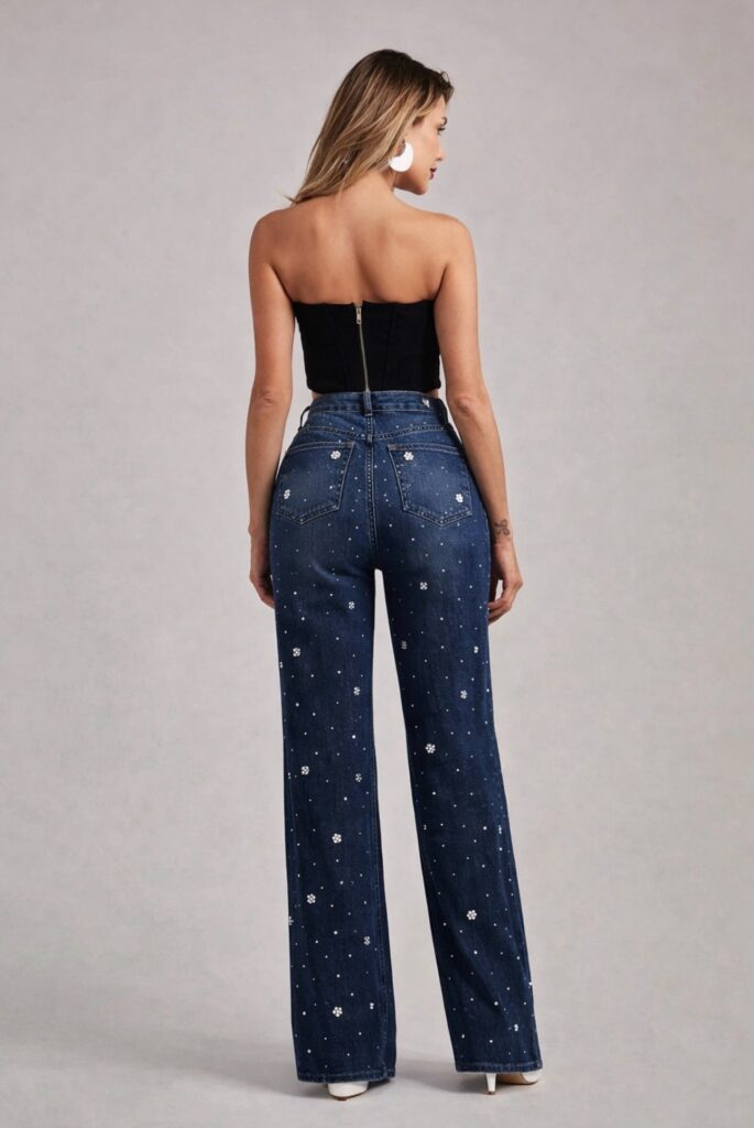 Calca Jeans Wideleg Perolada com efeito modelador que valoriza o corpo. Jeans premium com detalhes perolados. Disponivel do 36 ao 46.