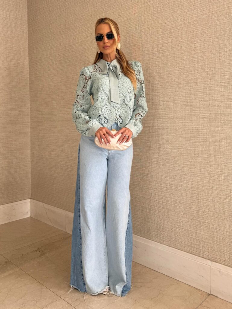 A Camisa Laise com Laco Verde Agua traz frescor e elegancia. Com renda vazada, manga longa e laco no pescoco que adiciona charme ao visual.
