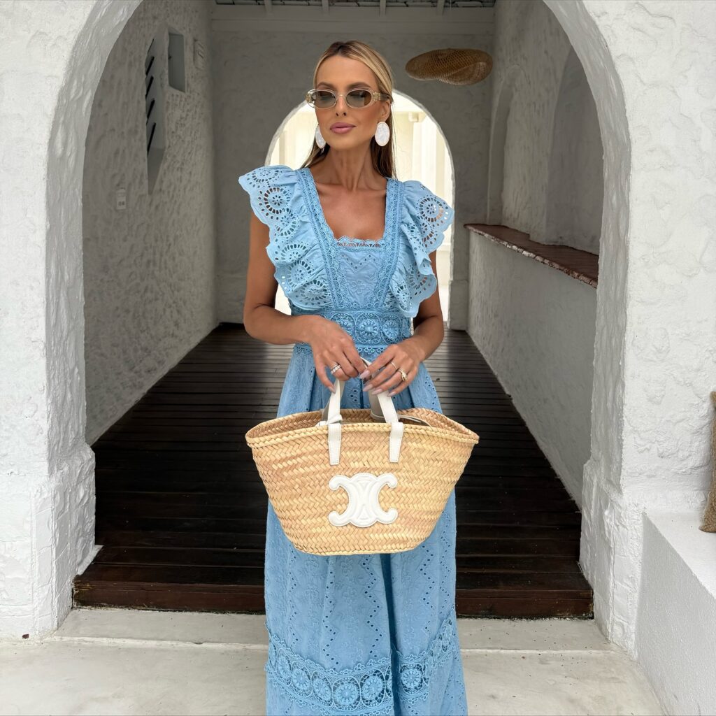 O Vestido Longo Laise Azul Claro e uma peca de impacto. Com decote quadrado, babados nos ombros e saia ampla em laise vazada.