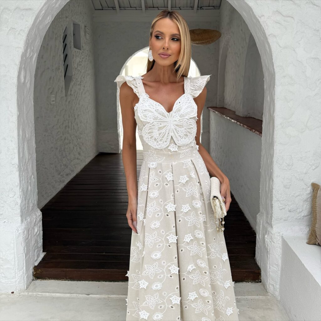 O Vestido Midi Laise Borboleta e uma peca unica. Com borboleta tridimensional no busto, flores aplicadas na saia e laise vazada.